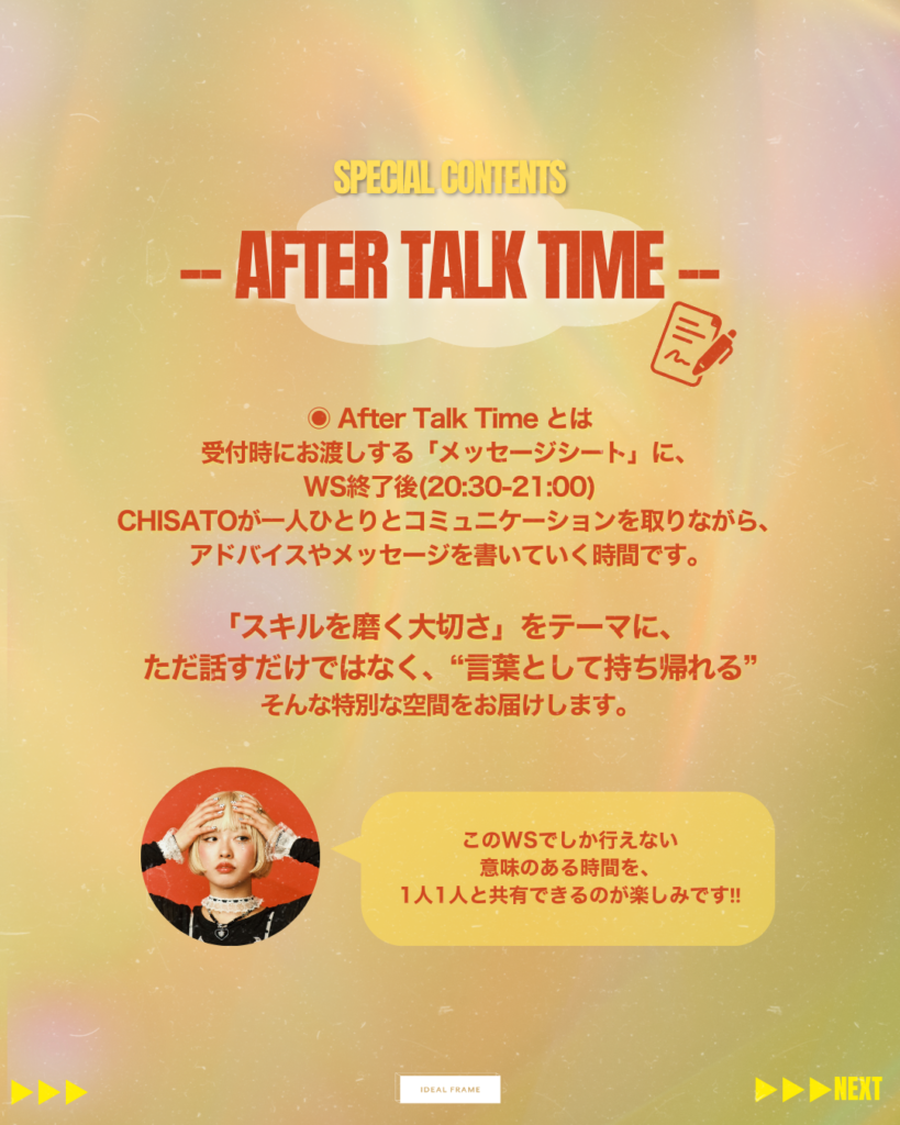 WS後には「After Talk Time」を設け、CHISATOが一人ひとりとコミュニケーションを取りながら、アドバイスなどを「メッセージシート」に書いていきます。